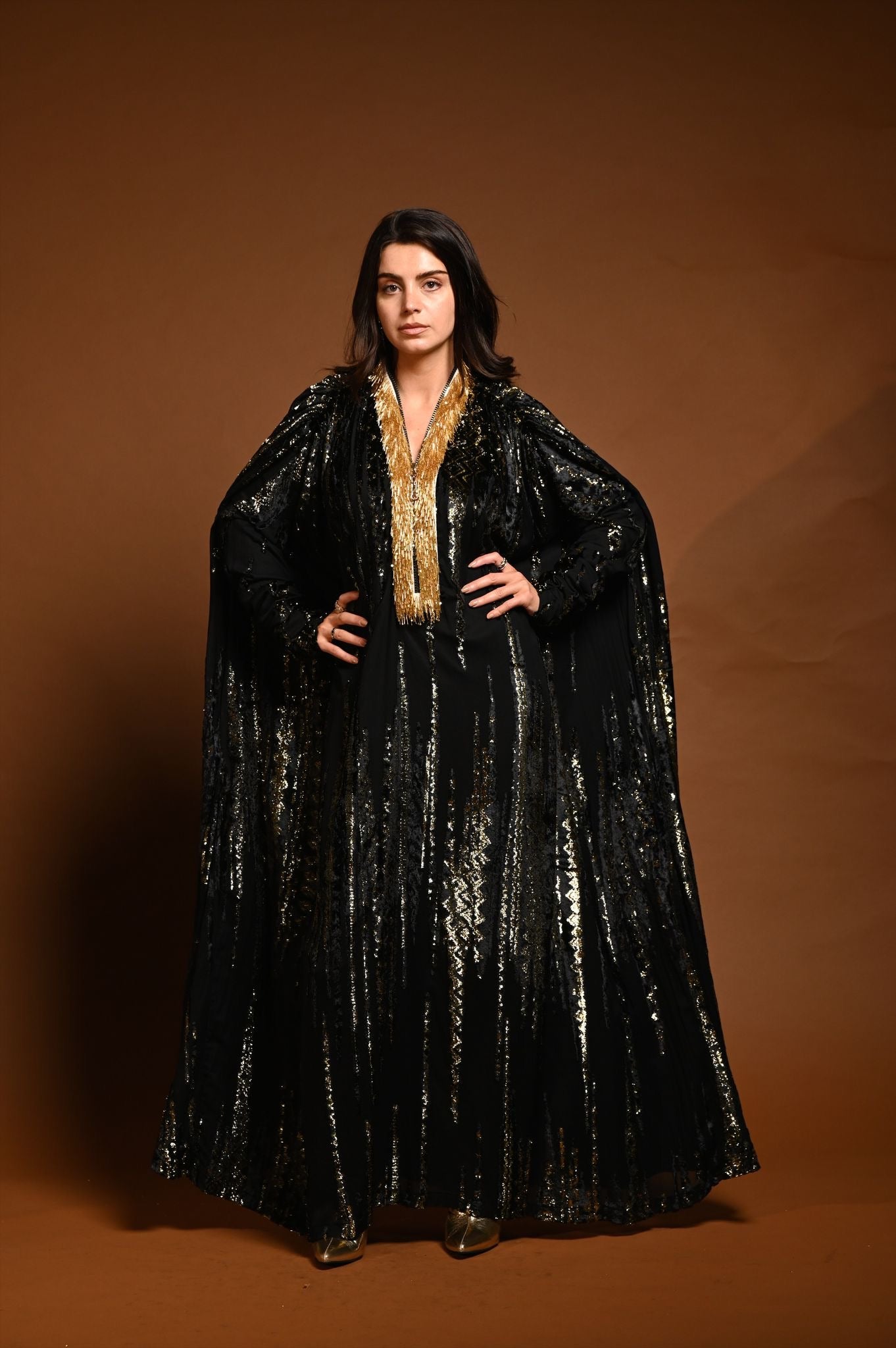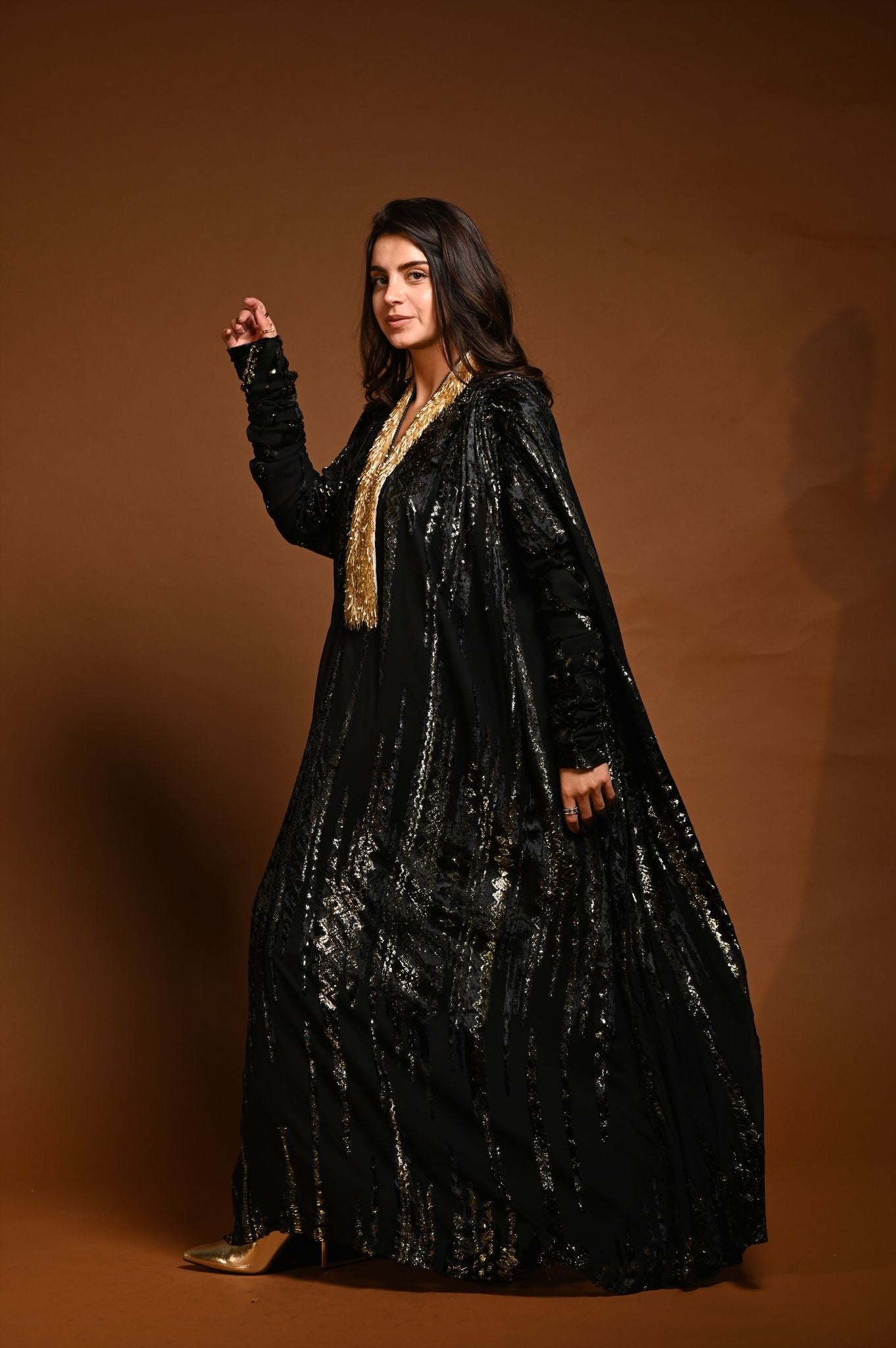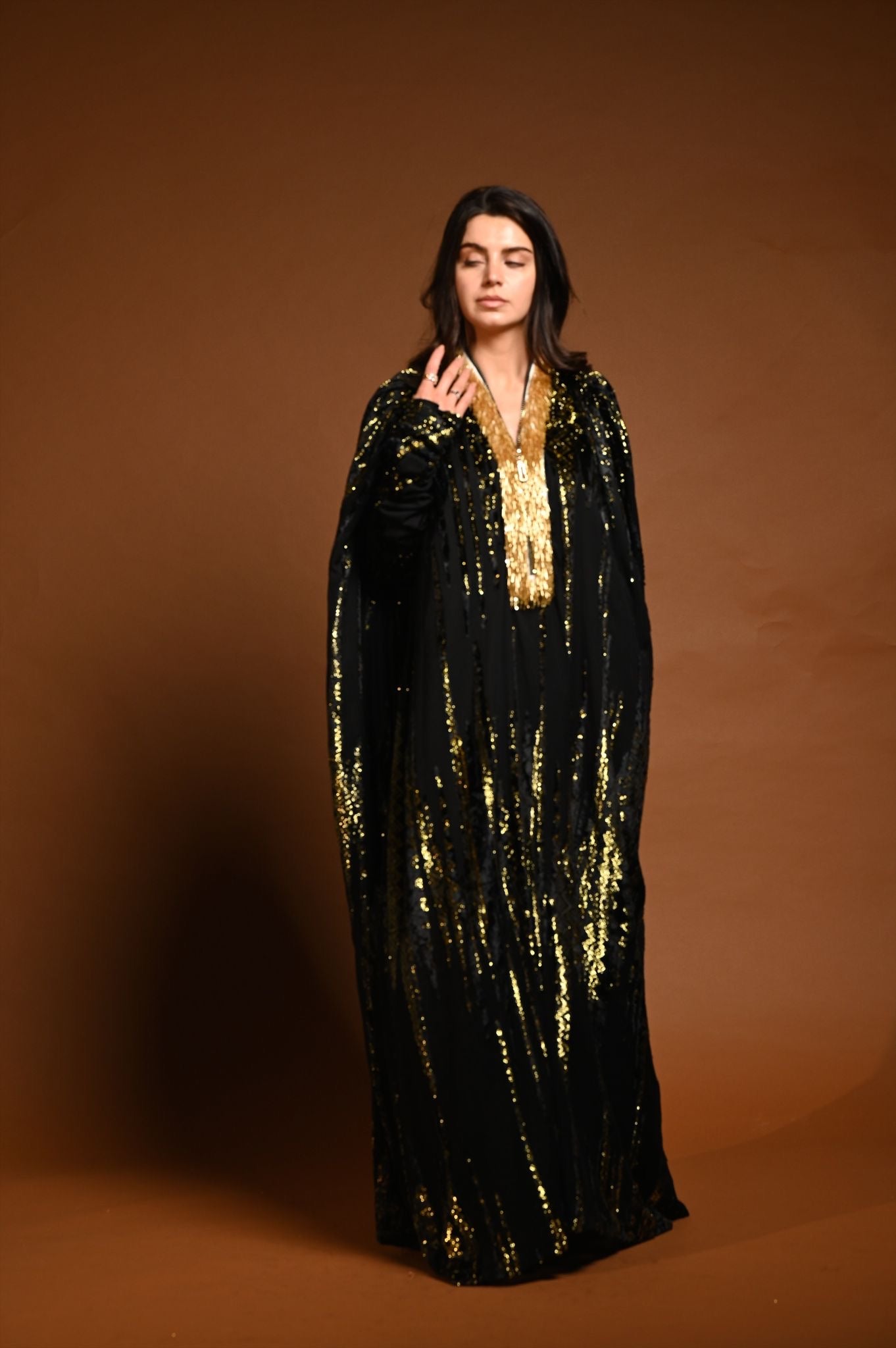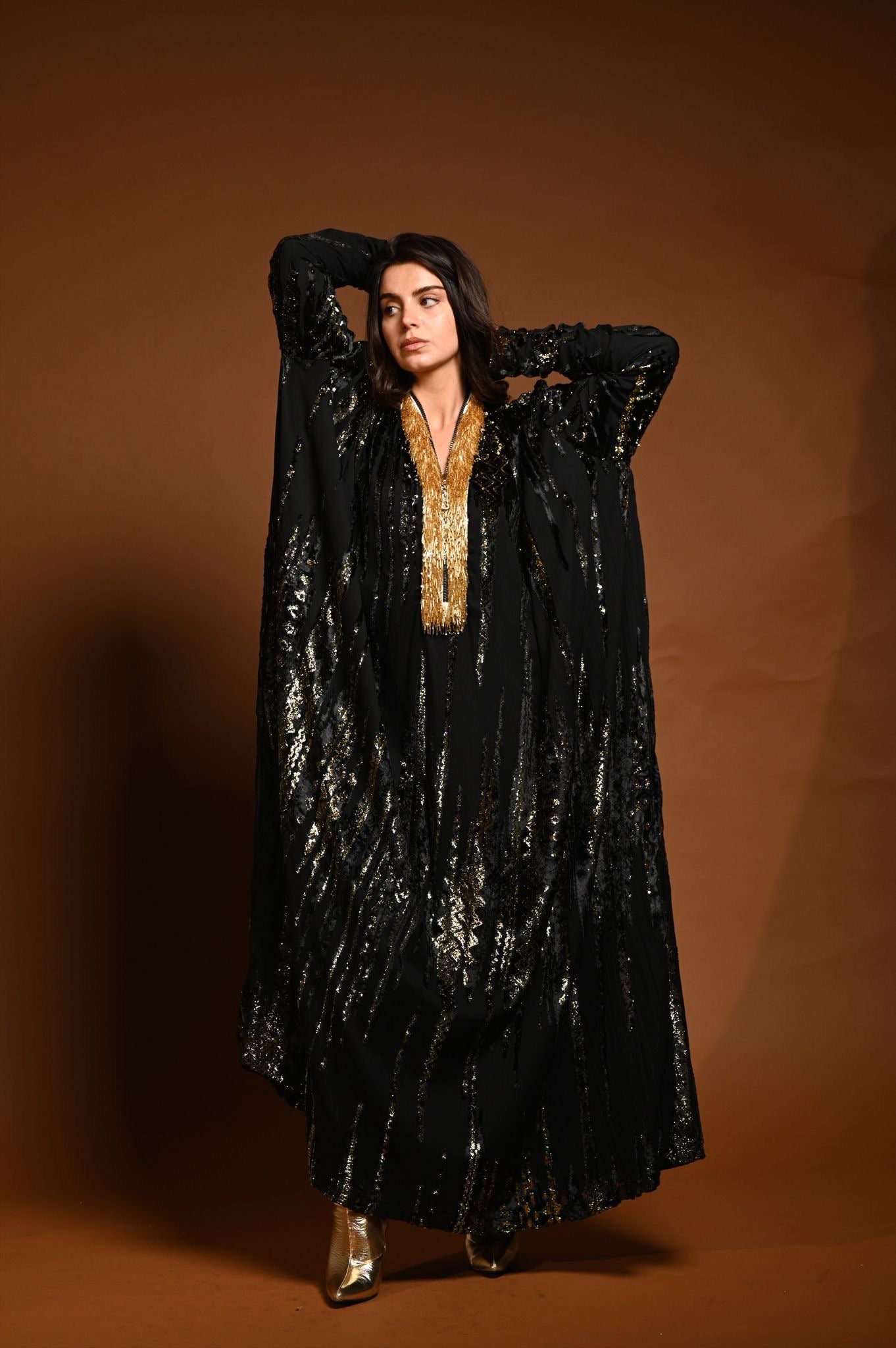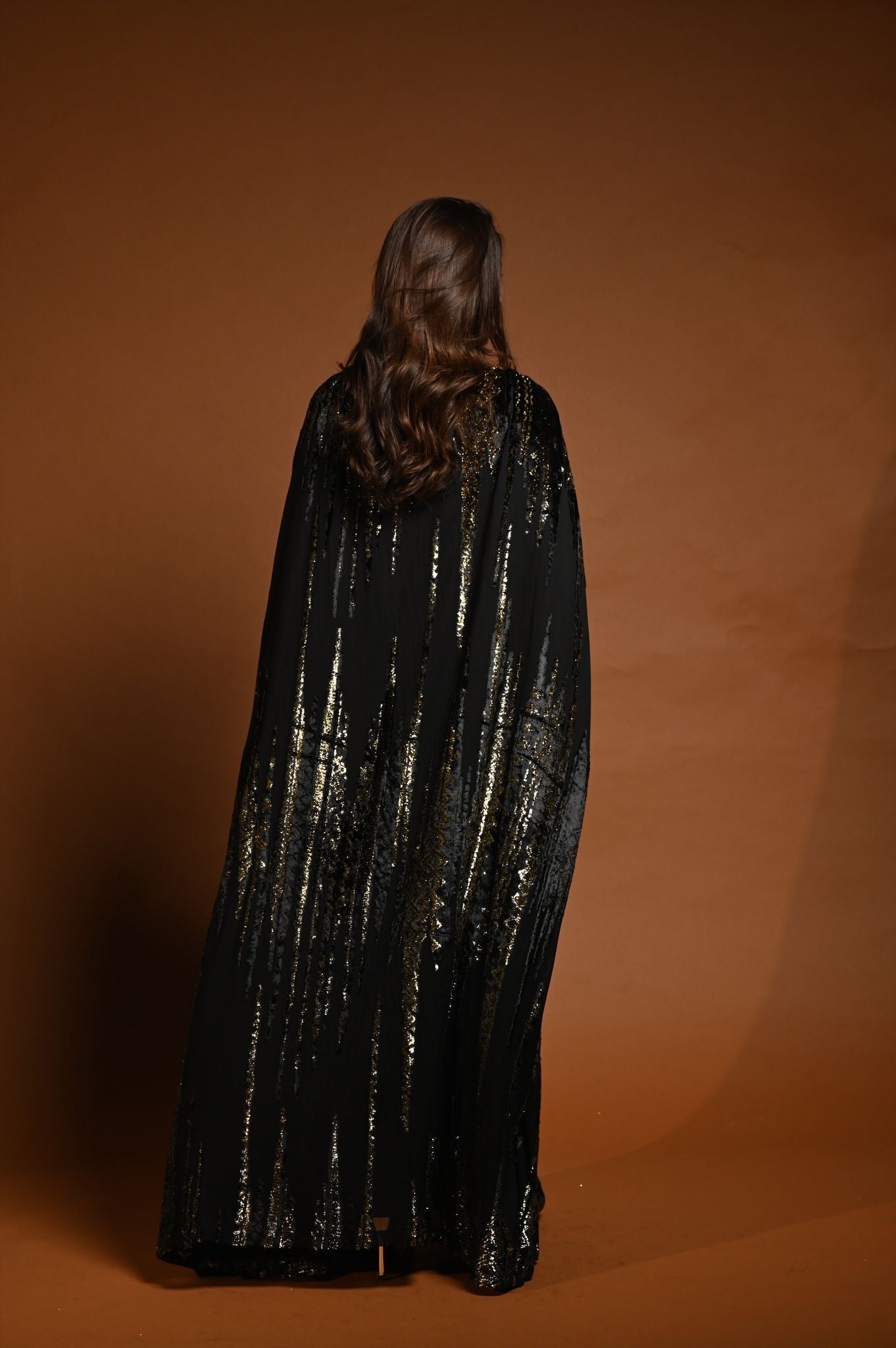 القماش حرير شيفون منقوش بالمخمل و الزري و القولة شك