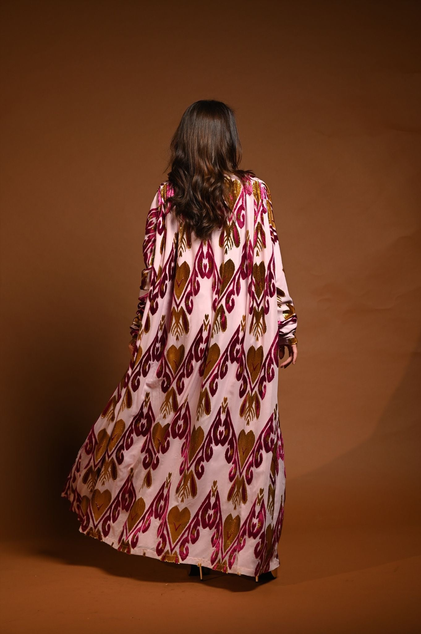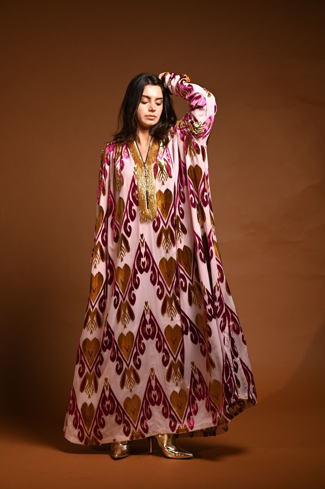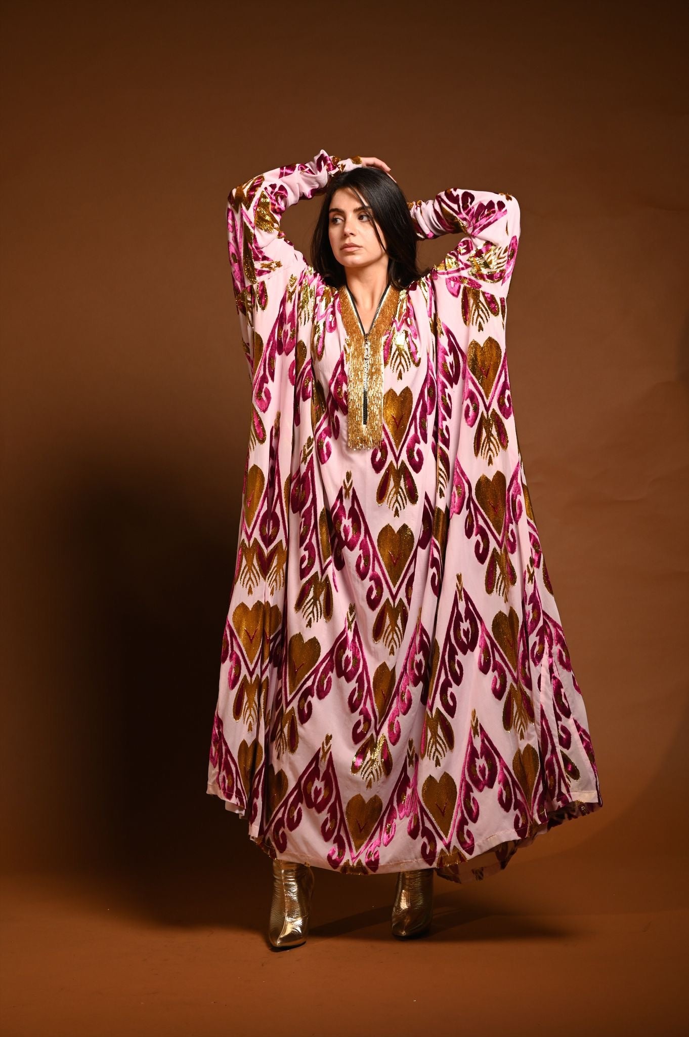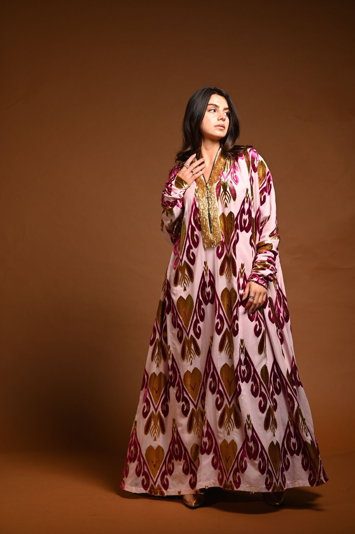 القماش حرير شيفون منقوش بالمخمل و الزري و القولة شك