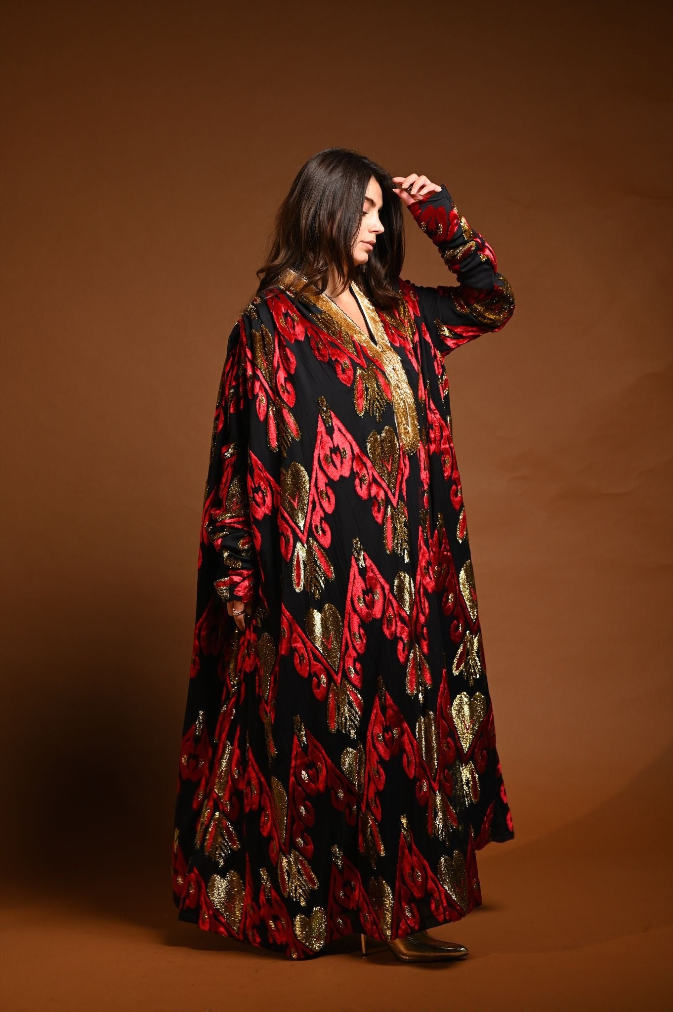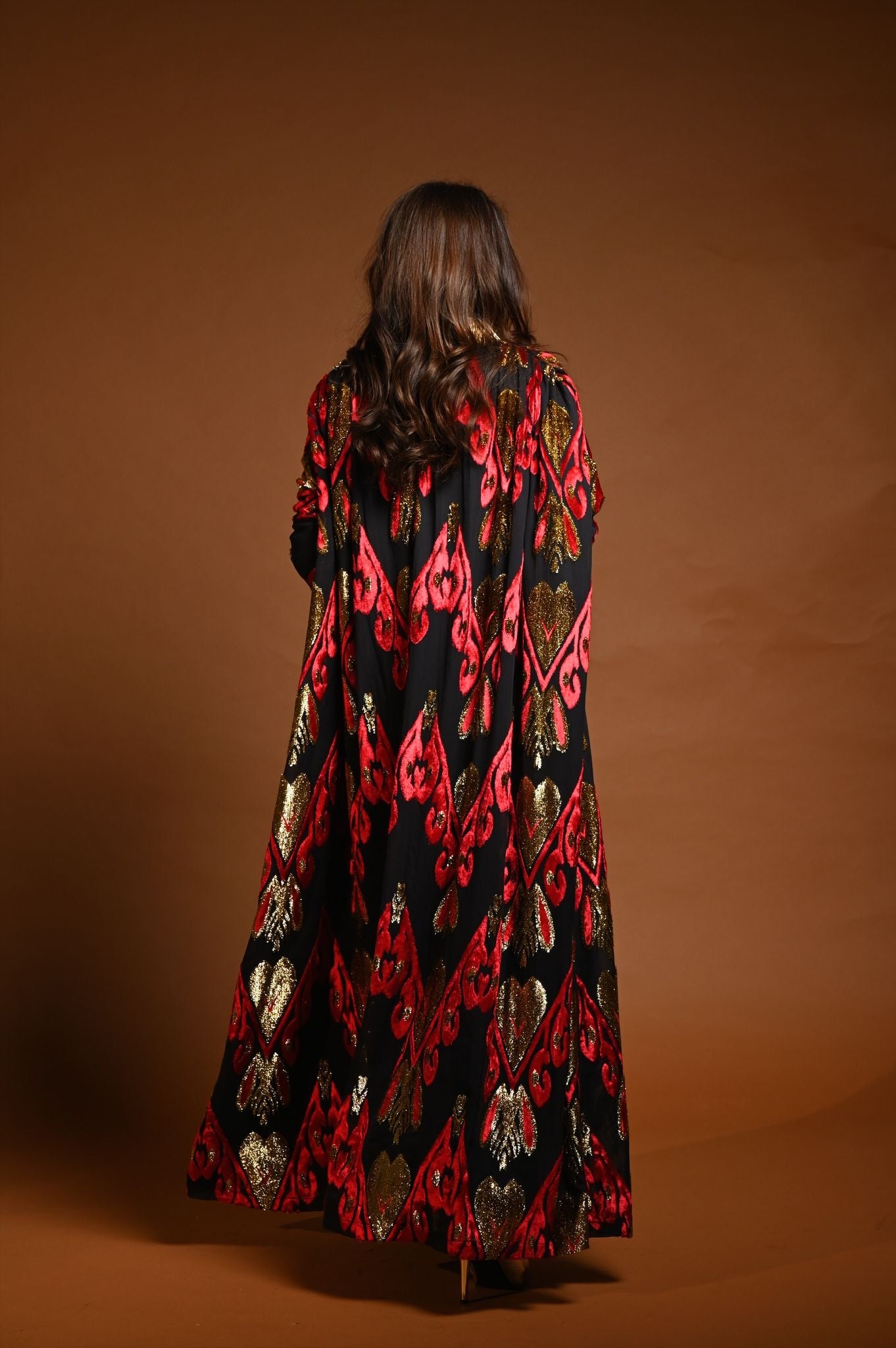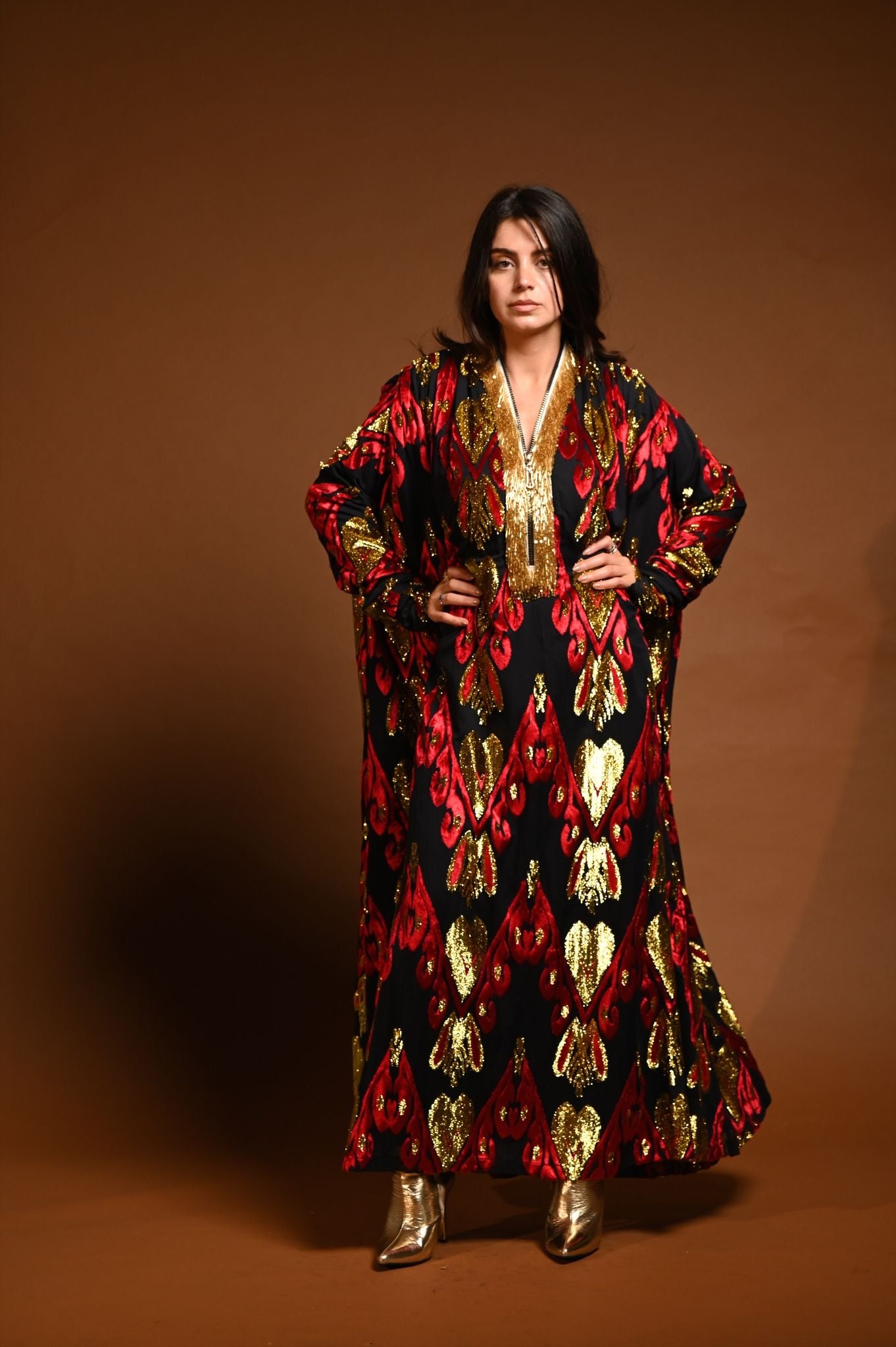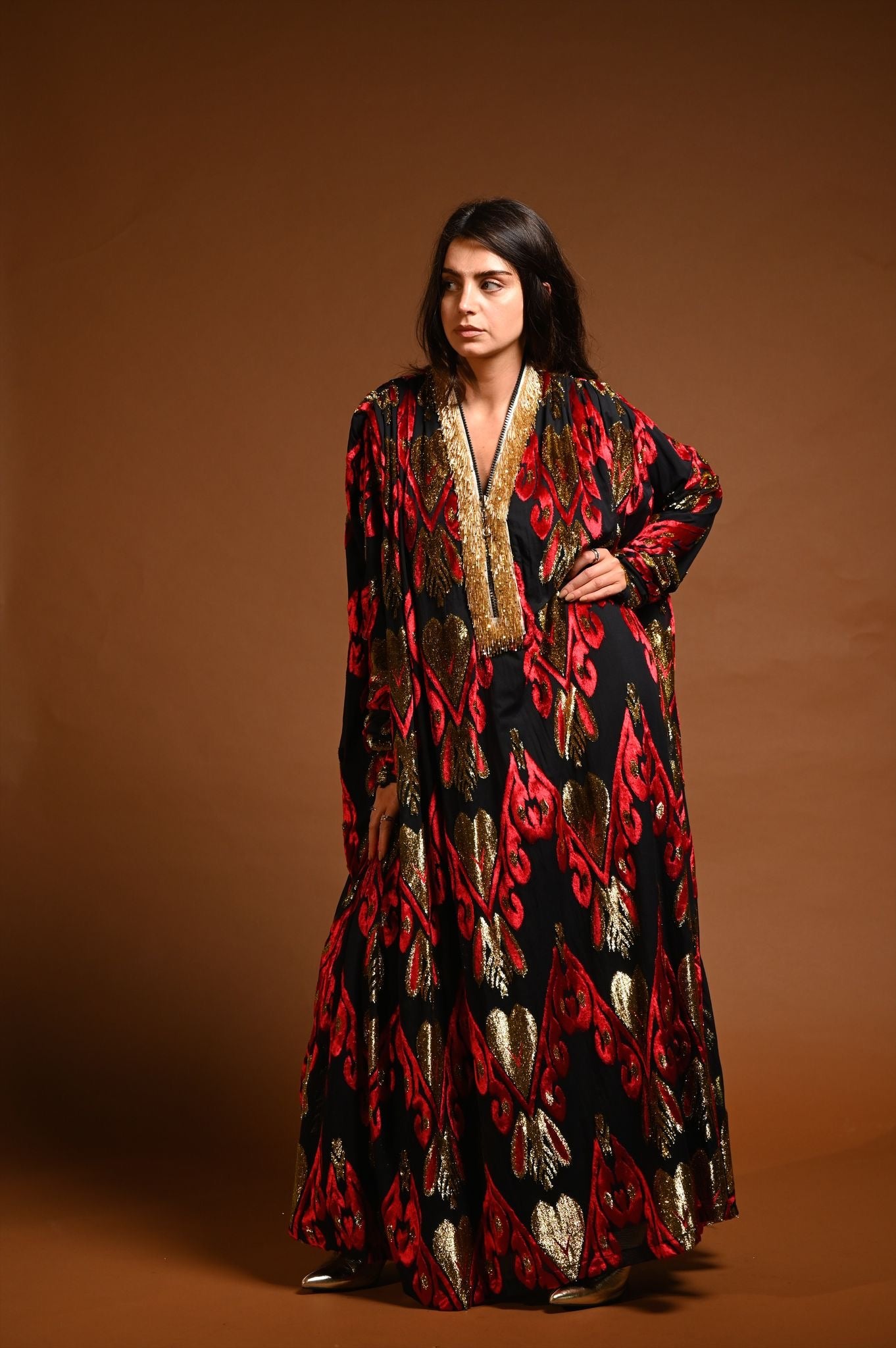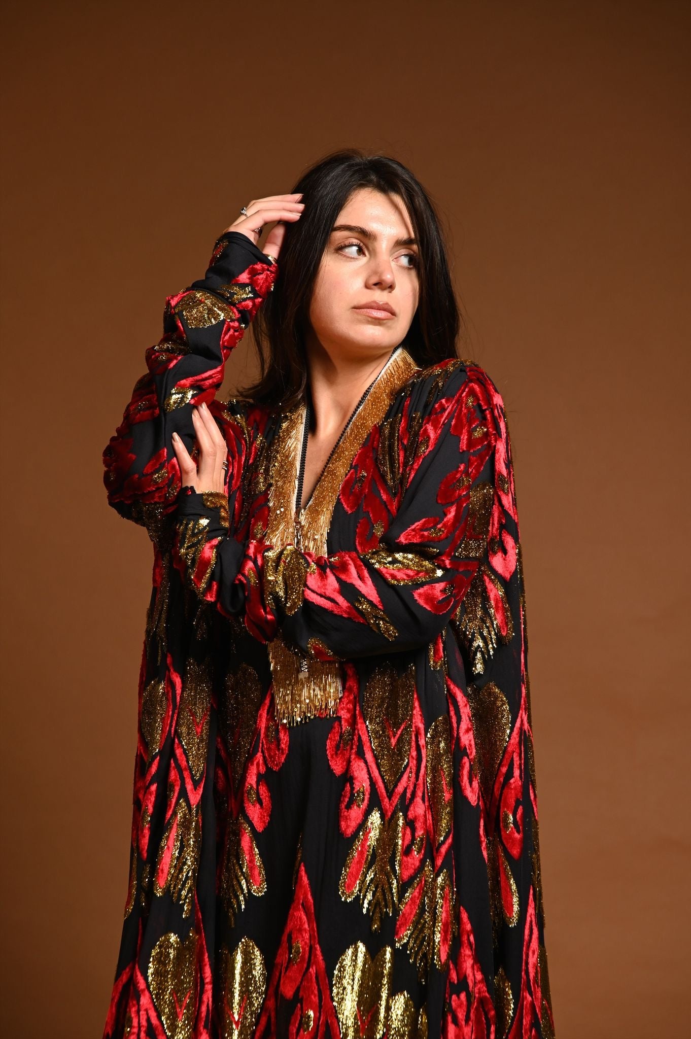 القماش حرير شيفون منقوش بالمخمل و الزري و القولة شك