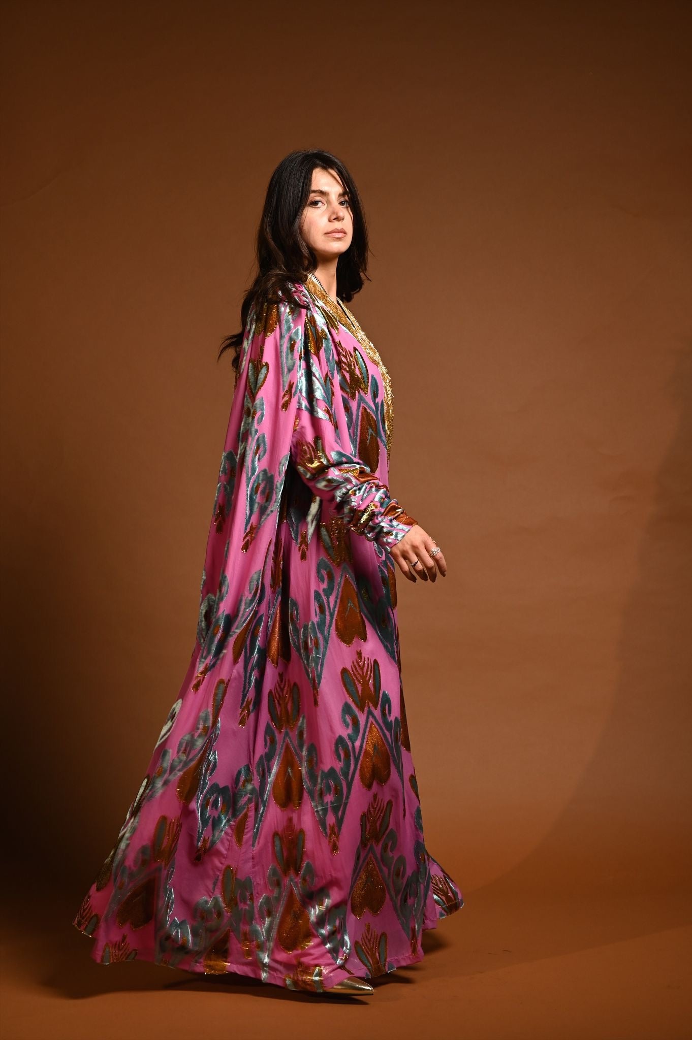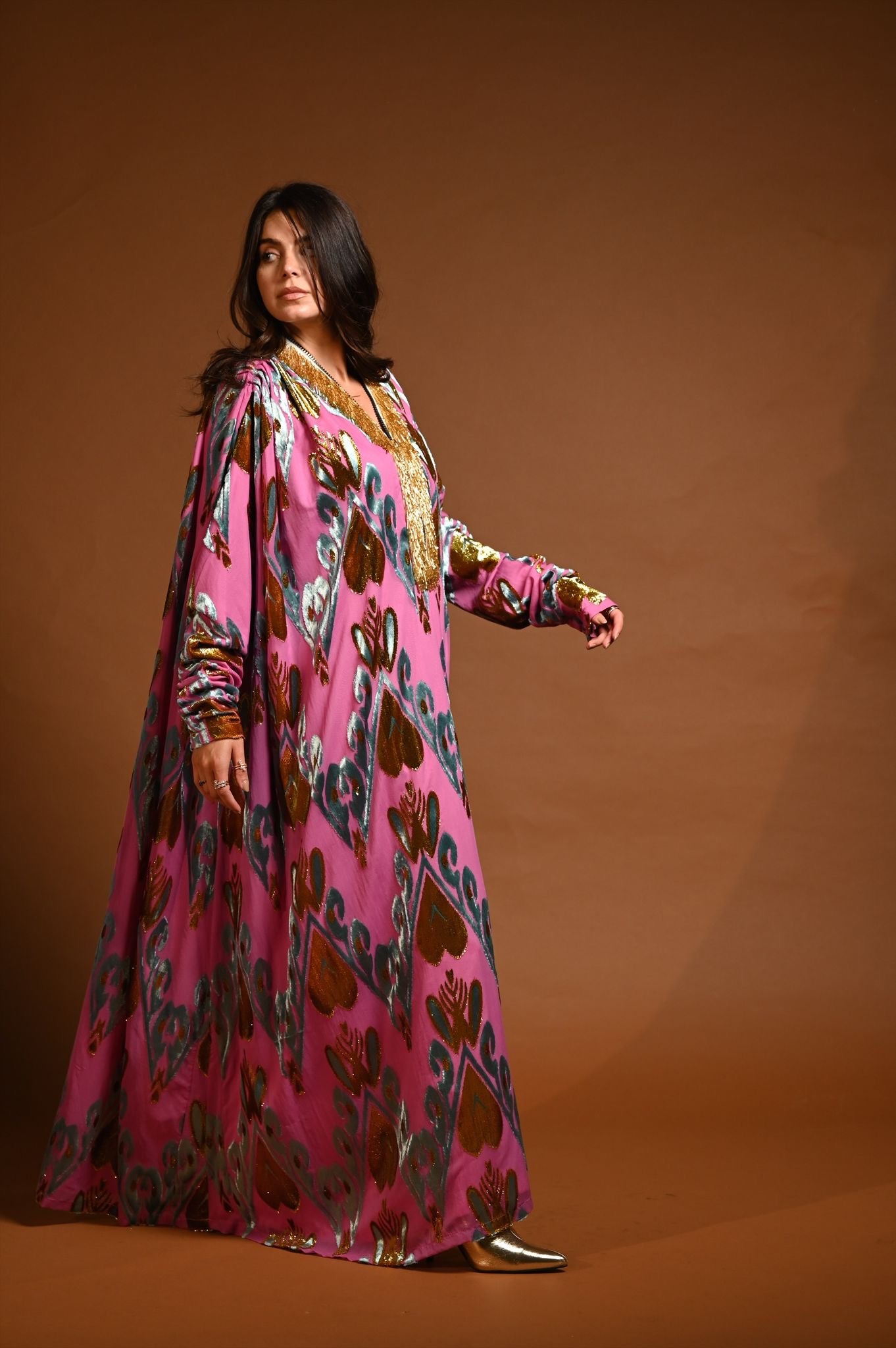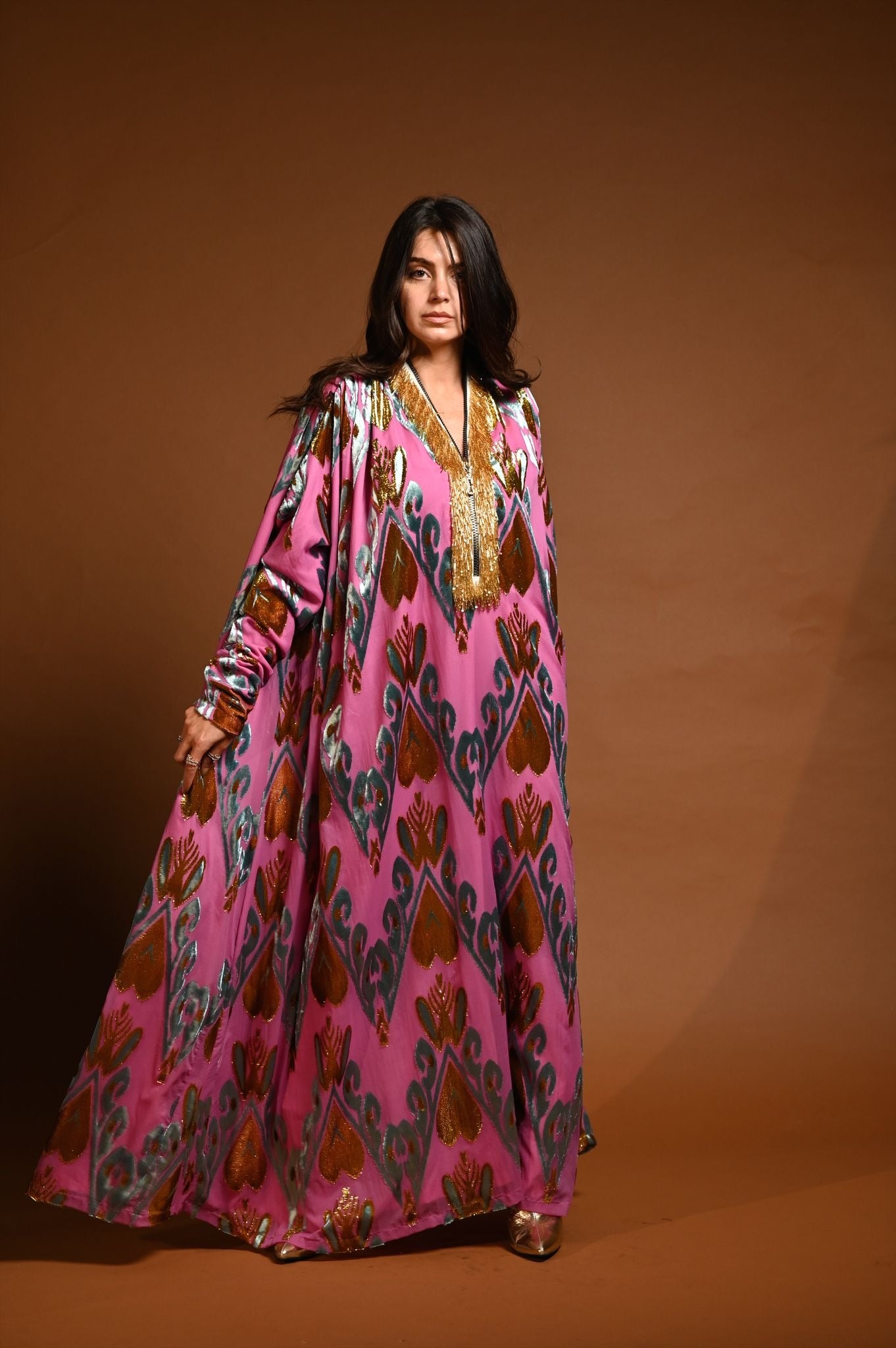 القماش حرير شيفون منقوش بالمخمل و الزري و القولة شك