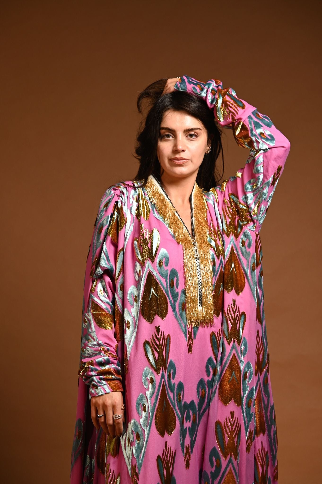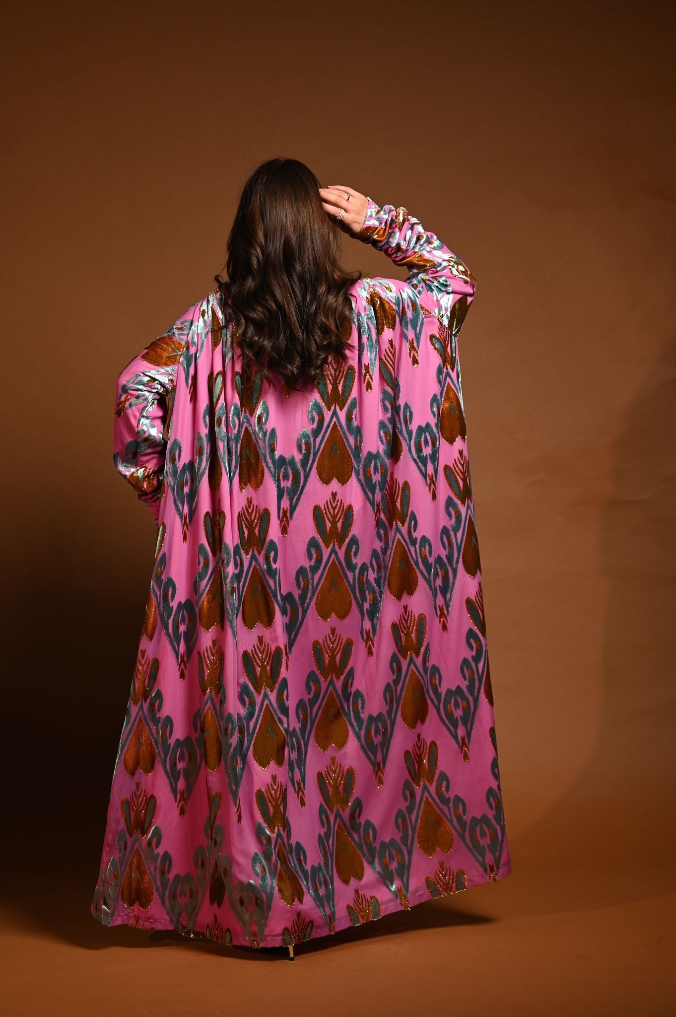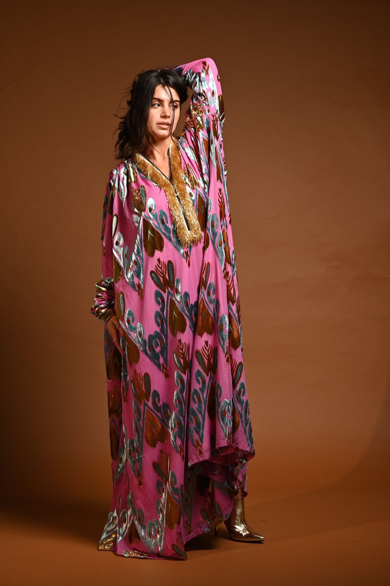 القماش حرير شيفون منقوش بالمخمل و الزري و القولة شك