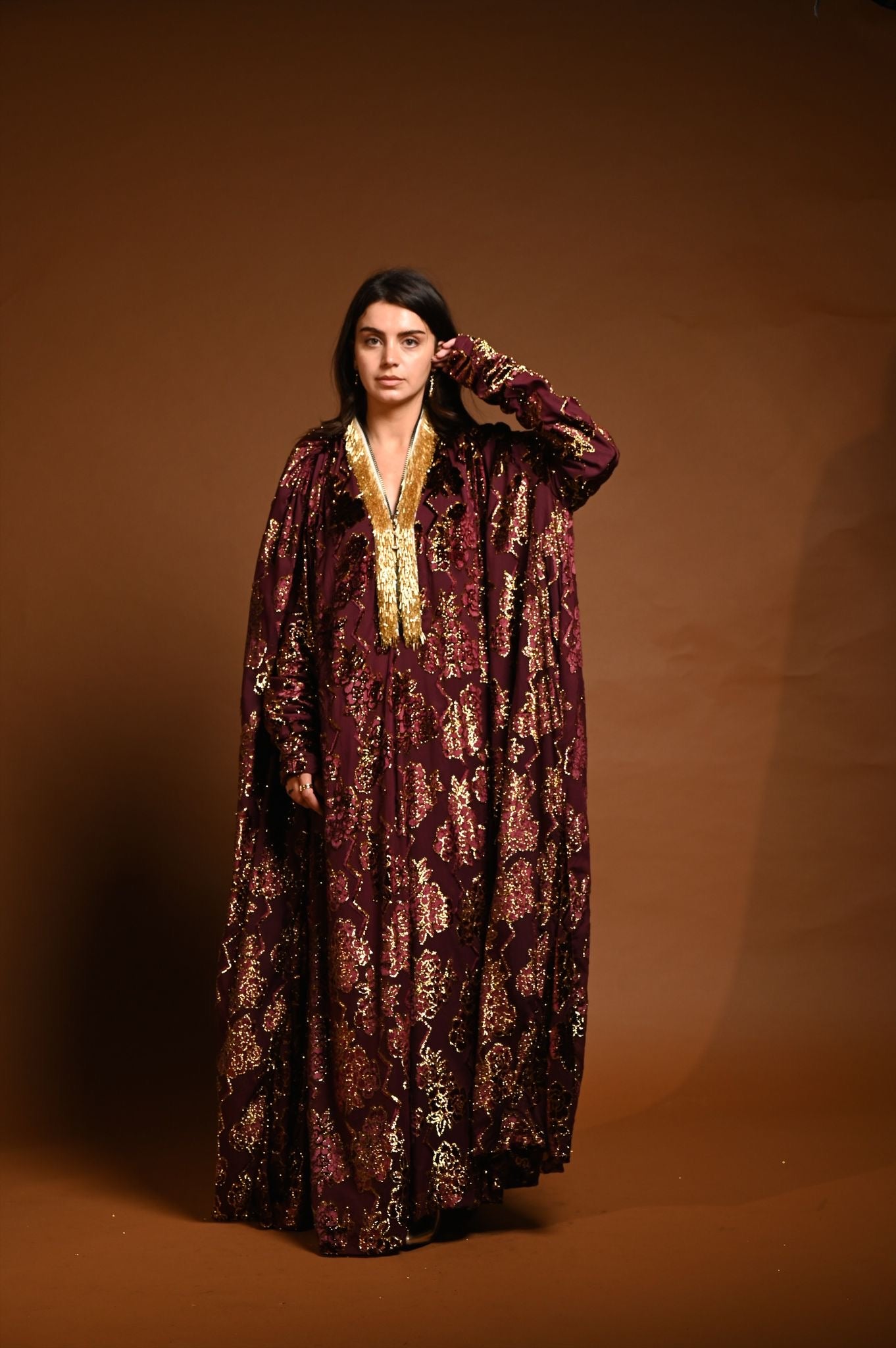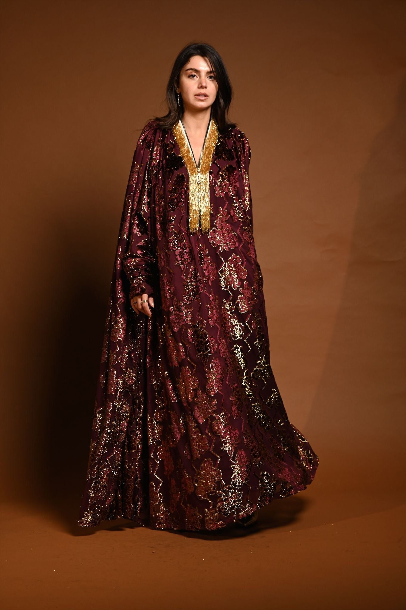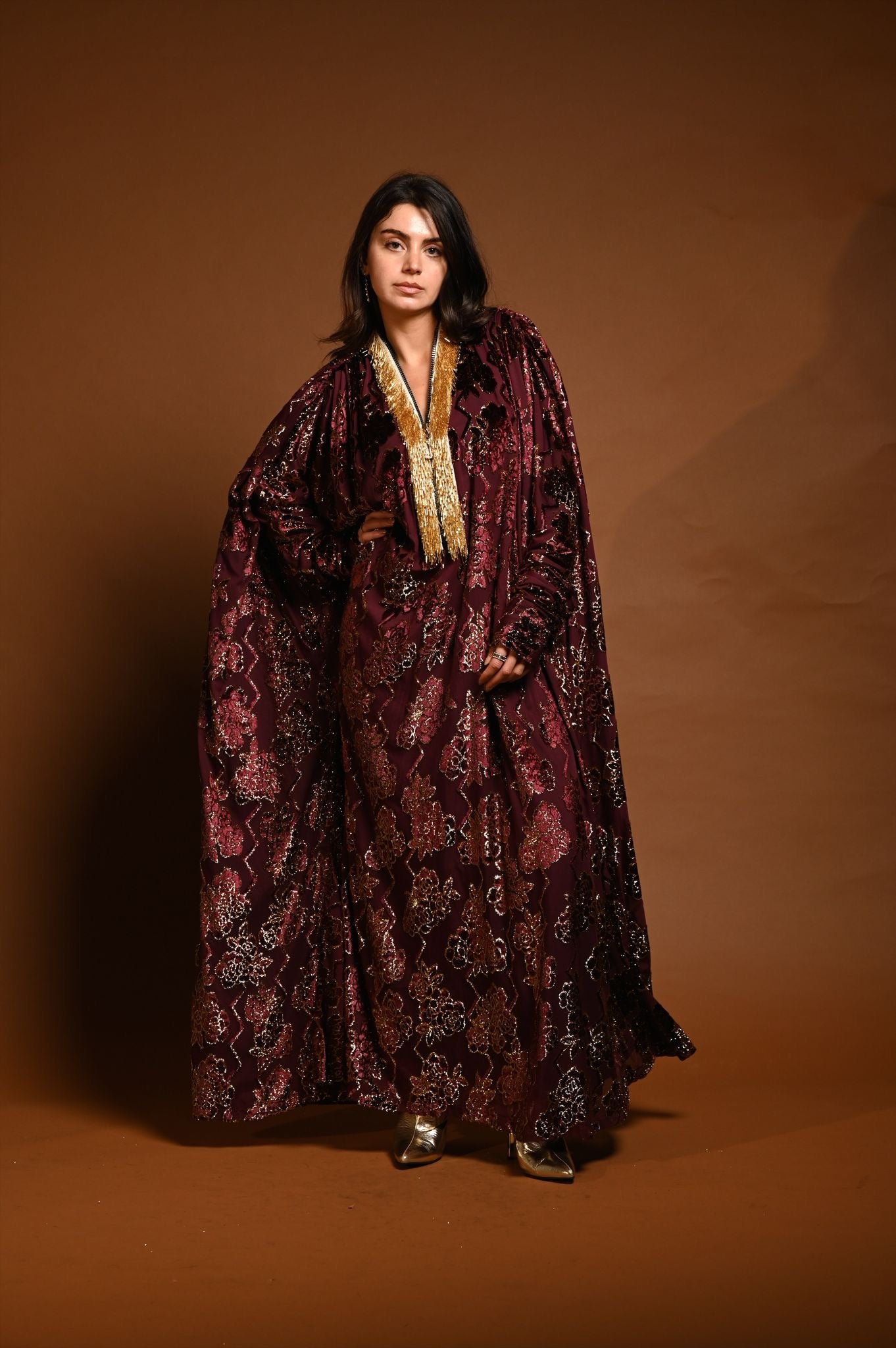 القماش حرير شيفون منقوش بالمخمل و الزري و القولة شك