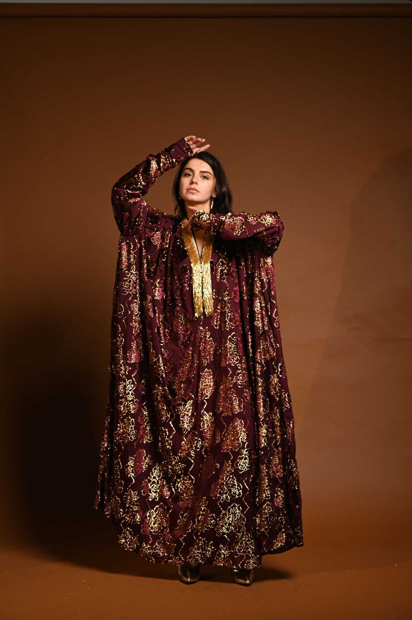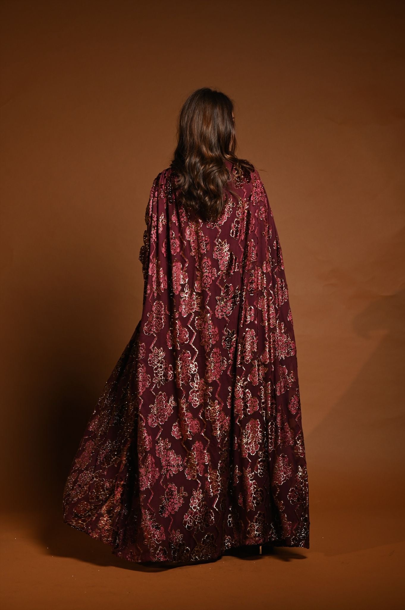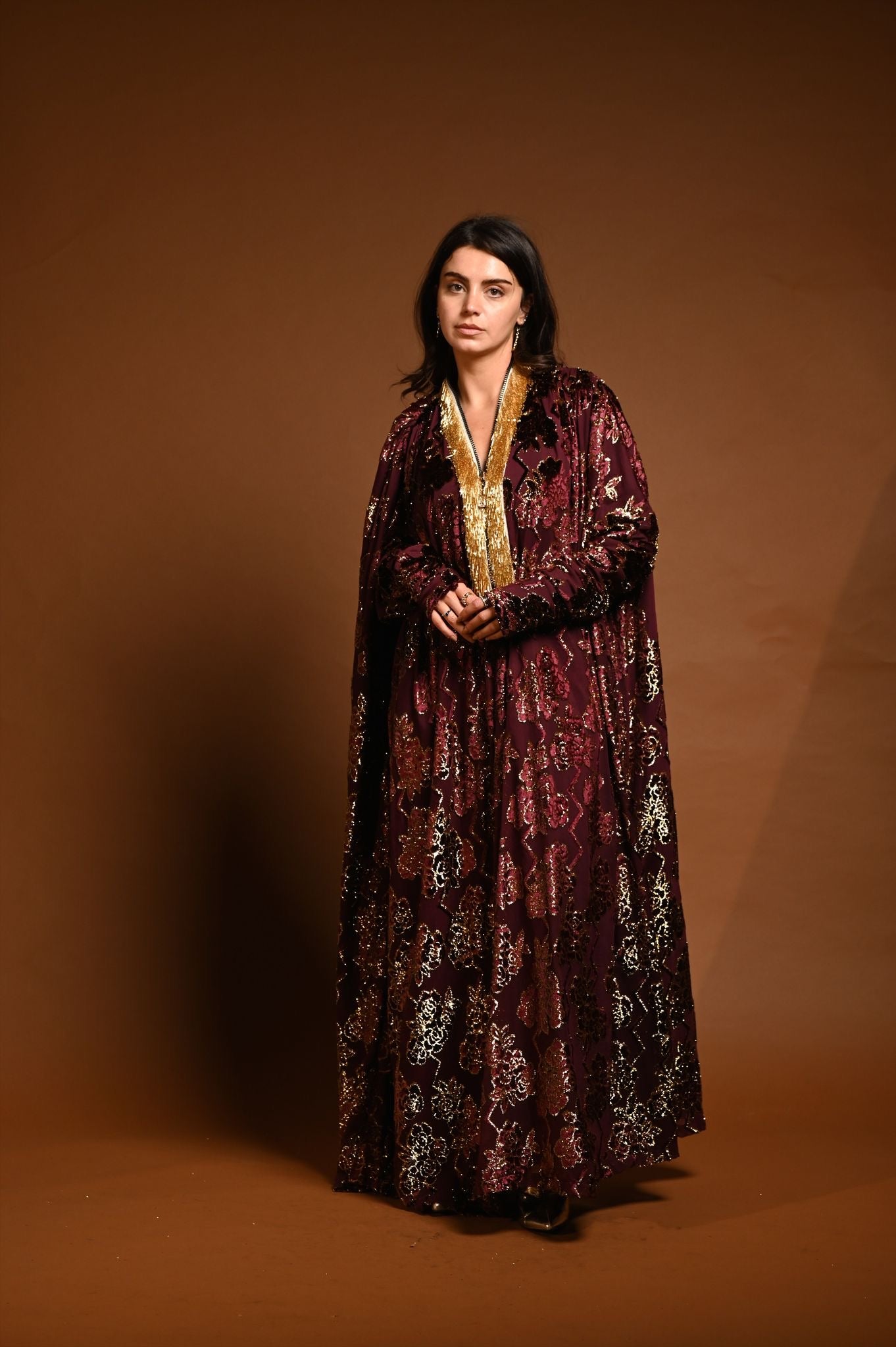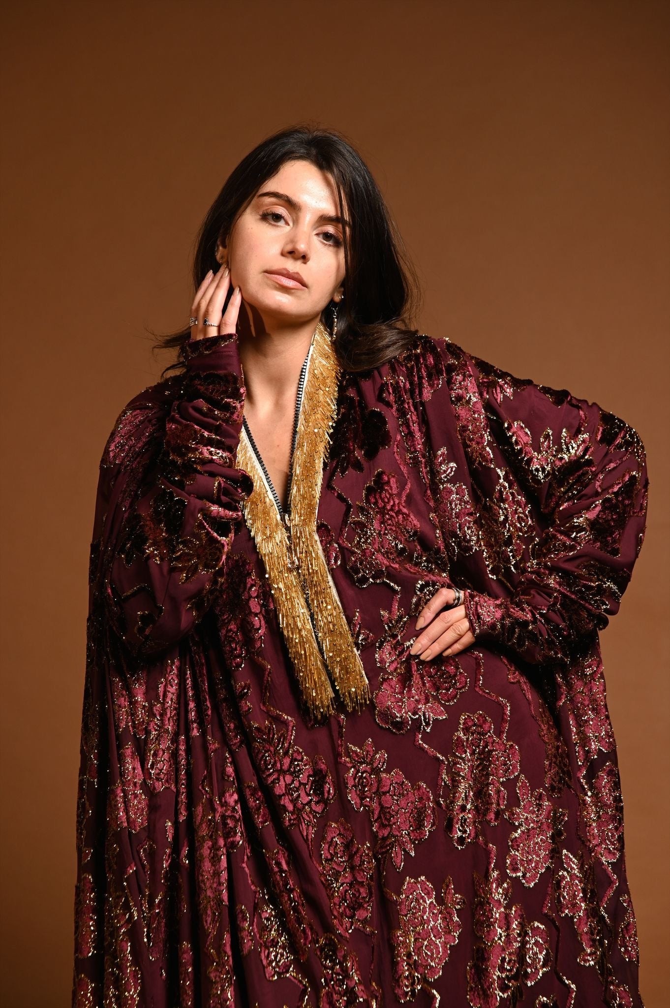 القماش حرير شيفون منقوش بالمخمل و الزري و القولة شك