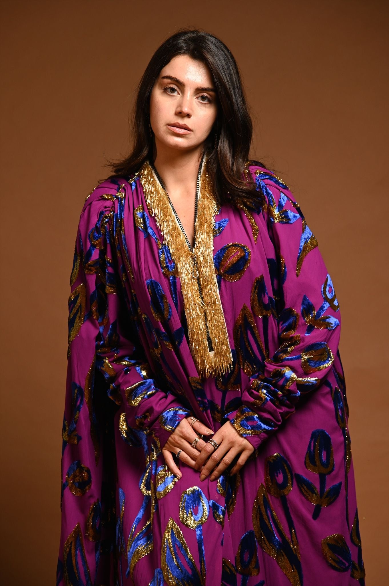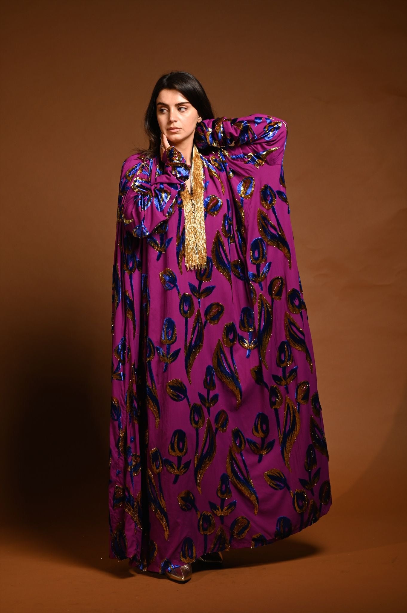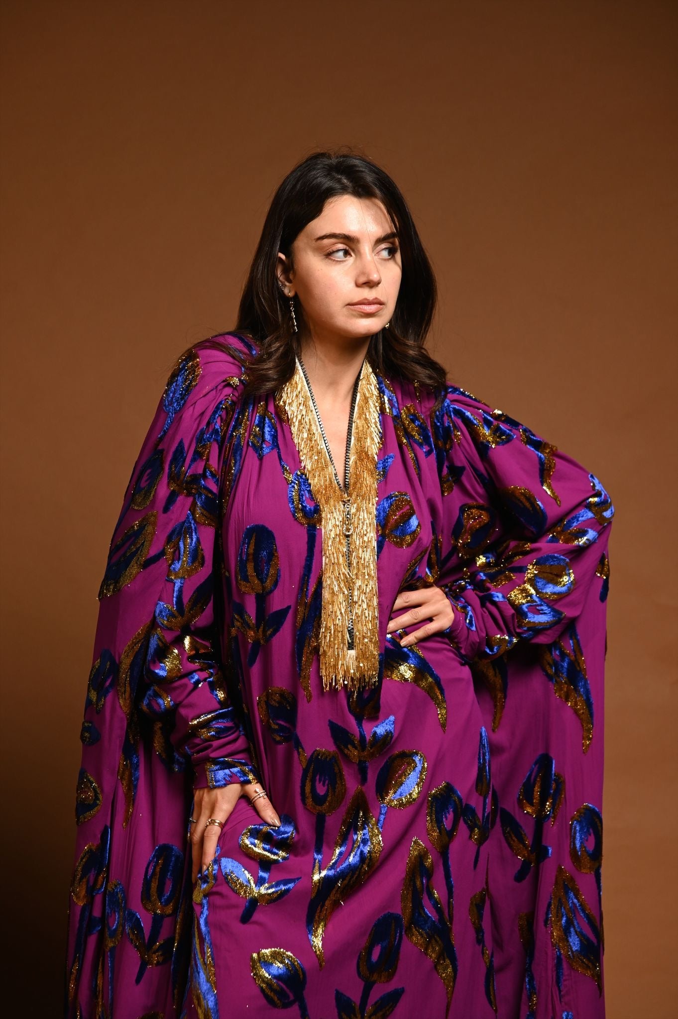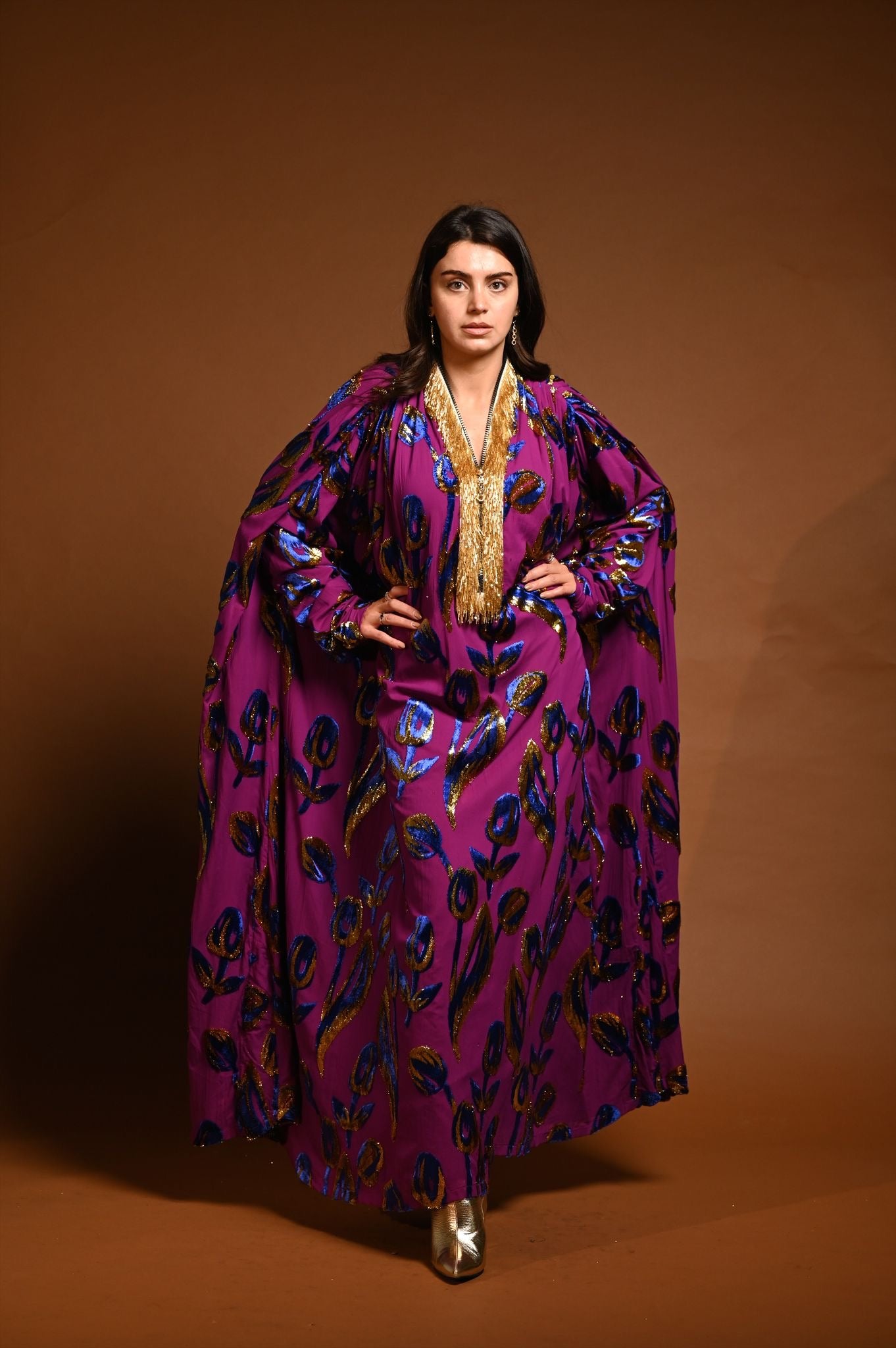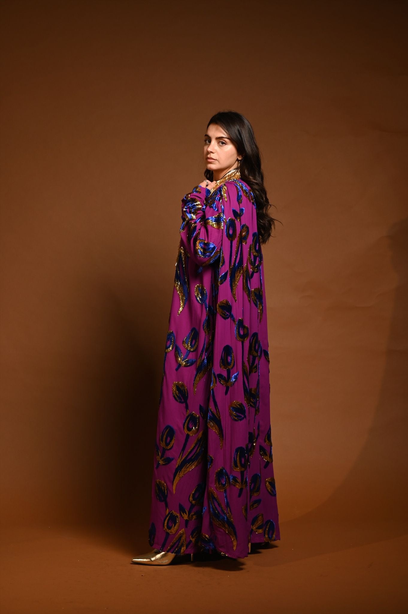 القماش حرير شيفون منقوش بالمخمل و الزري و القولة شك